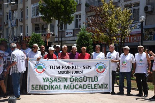 Emekliler, emekli maaşının ve bayram ikramiyesinin arttırılması talebiyle eylem yaptı. Özgür Çocuk Parkında yapılan eylemde emekliler, “İnsanca Yaşamak İstiyoruz” diye sloganlar attı. Emekliler adına açıklama yapan 2021 Tüm Emekli-Sen Mersin Şube Başkanı Hüseyin Kurt, verilen maaşların kiraya bile yetmediğini belirterek, “Ekonomik krizin faturasını emekliler ödemek istemiyor” dedi.